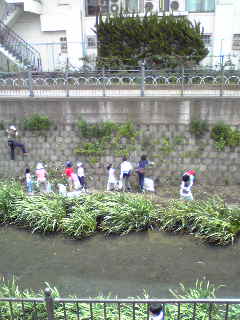 上大岡駅近くの川の掃除をしている集団を発見しました。