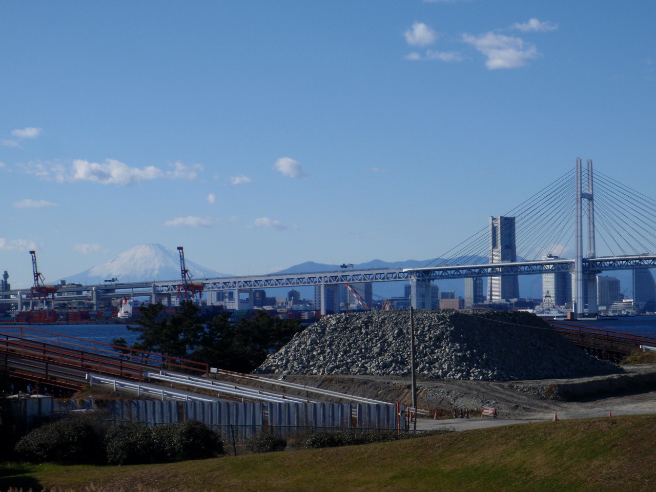 大黒の「海づり公園」から、みなとみらいのバックに富士山が大きく見えました。