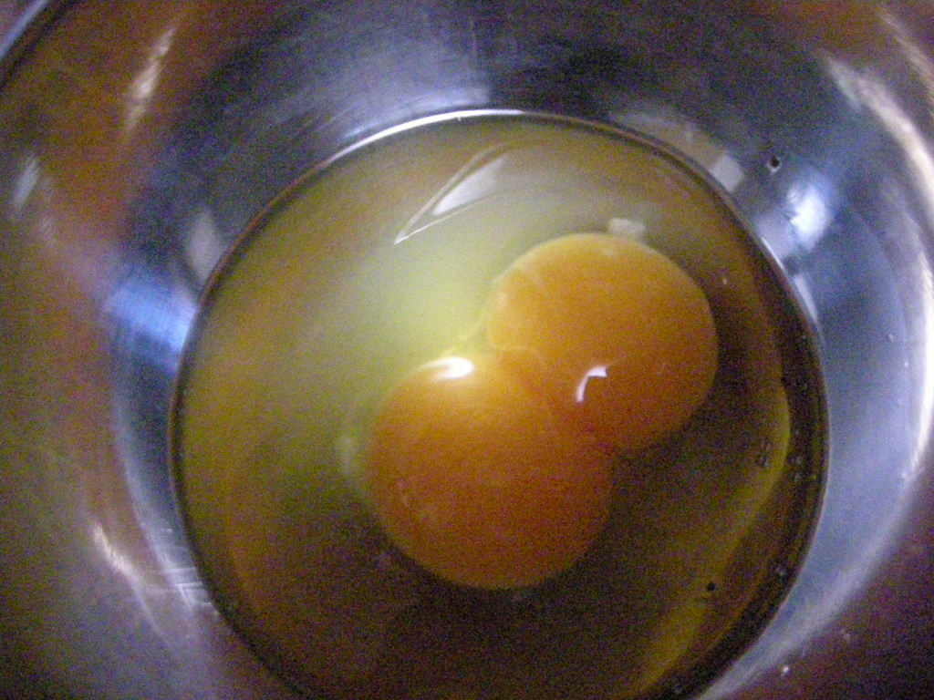 家内が料理中、一個の卵に二つの黄身が入ったものを発見しました。
