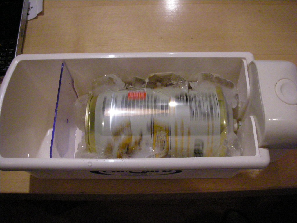 機械についている吸盤を缶ビールの底にくっ付け、氷を数個入れ、スイッチON。