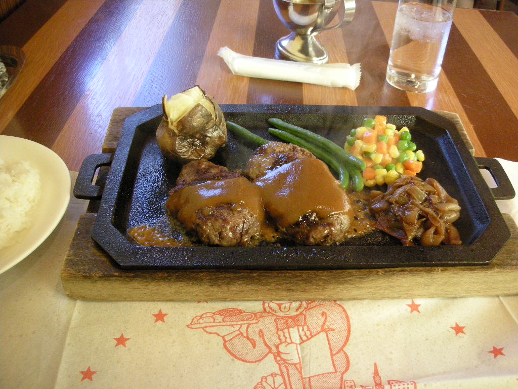 鉄板に乗ったフットボール型のハンバーグがテーブルに運ばれて来ると、店員さんがそのハンバーグを縦に割って鉄板でジューと焼いて仕上げてくれます。