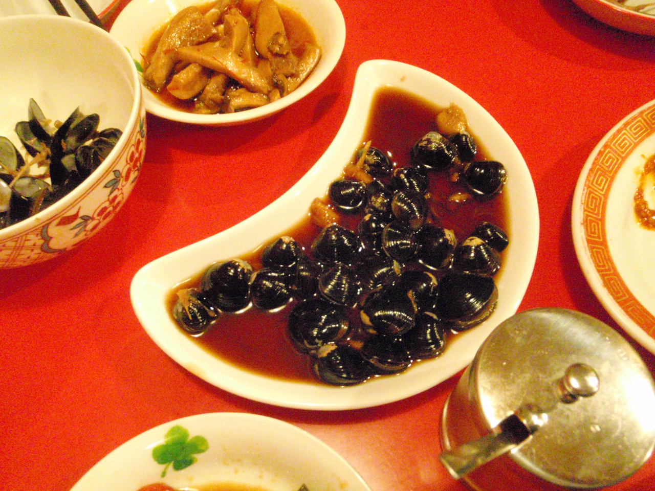 写真は 「 しじみの醤油(?)漬け 」 ・ 「鴨の舌の醤油(?)煮」 ・ 「蒸し魚(せいご)」 です。