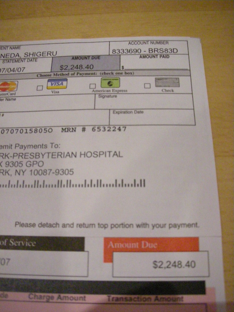 帰国して日本で念のため同じ症状で掛かった時は15分で終わり費用は1500円でしたが、アメリカでは9時間も待たされた挙げ句に請求額は$2248でした