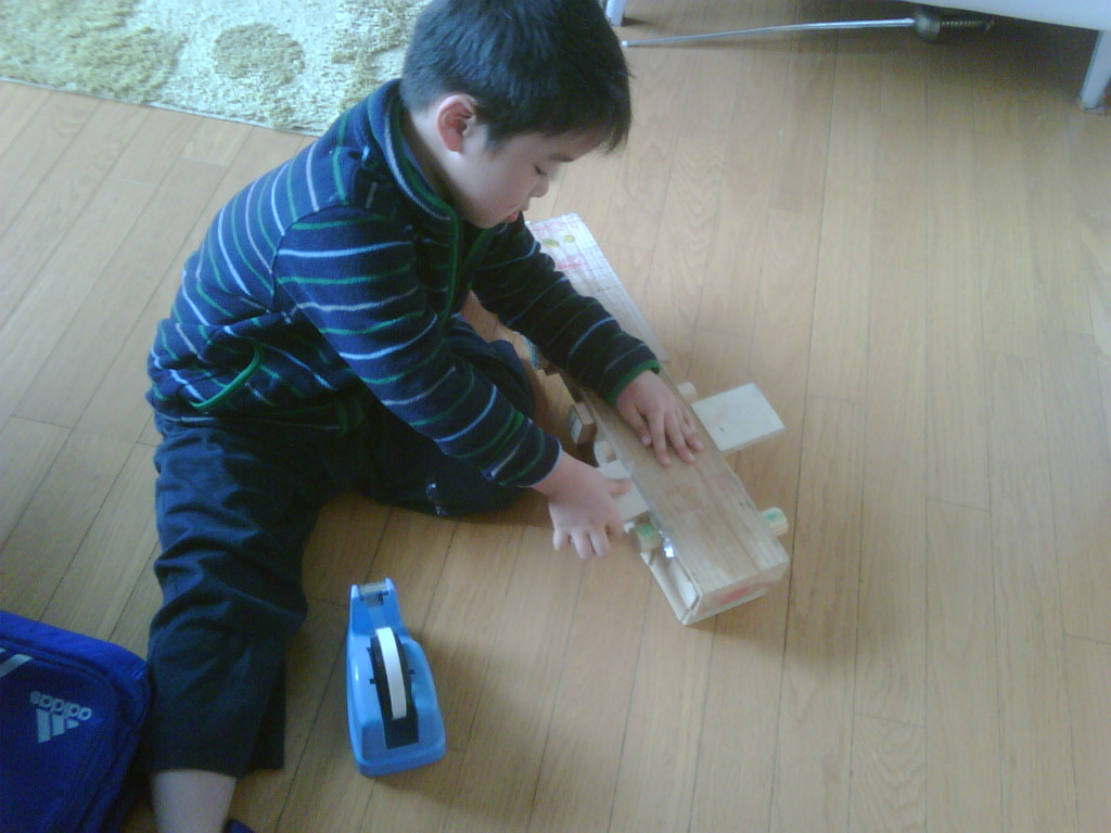 木製のオモチャであろうと、どこかが折れるとセロテープで直そうとします。