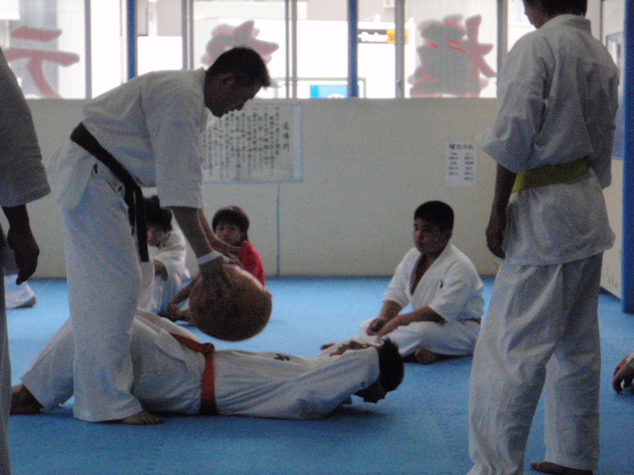 岸本準指導員が中心になって有志が集まり腹踏み・腹打ちなど、打たれ強さの為の鍛錬が行なわれます。