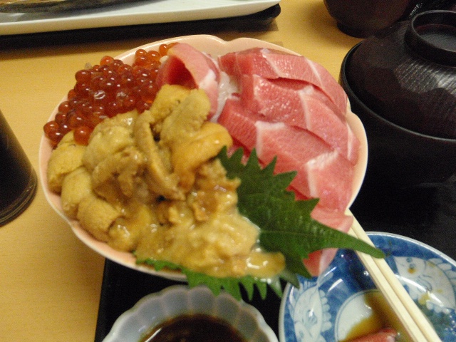 札幌中央市場近くのお店で食べた 「 うに・いくら・まぐろ丼 」 です。
