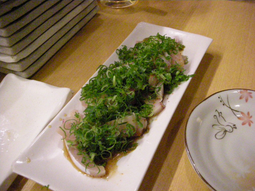 ぶりのブツ切りに青ねぎとポン酢をかけたツマミ。